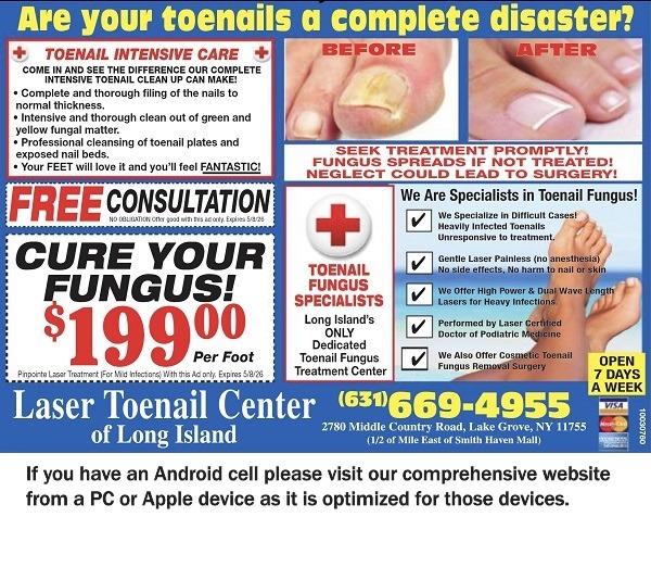 | Laser Toenail Long Island * FDA APPROVED * SAME DAY LASER APPOINTMENTS * FULL SCALE FUNGAL TOENAIL TREATMENT *Laser Toenail Center of long island * LaserToenailCenter.com * Laser Toenail Long Island * PinPointe Laser Long Island NY * Comprehensive Fungal Toenail Laser Center * Laser Toenail Center * LaserToenailCenter.com * Severe Fungal Toenails * Laser Fungal Toenails * Laser Toenail Fungus Laser * Fungal Nail Treatment * Pinpointe Fungal Laser Certified * Laser Toenails * Laser Fungus * PinPointe Fungus Laser * Laser Toenail Fungus * Fungal Toe Nails * Fungal Toe Nail Treatments * Fungal Infections * Toe Fungus * Fungal Toe Nail * Toenail Surgery * Laser Nail Fungus Removal * Laser Fungus Nail Treatment * Laser Fungus * Laser Fungal Treatment * Laser Fungal Nails * *Photodynamic Photo Dynamic Therapy * Located close to: Amityville, Babylon, Copiague, Deer Park, Lindenhurst, North Amityville, North Babylon, West Babylon, West Islip,Calverton, Centereach, Center Moriches, Coram, East Moriches, East Patchogue, Eastport, East Setauket, Farmingville, Holbrook, North Patchogue, Patchogue, Port Jefferson, Sound Beach, Stony Brook, Upton, Wading River, Yaphank, Town of Huntington, Centerport, Cold Spring Harbor, Commack, East Northport, Greenlawn, Huntington, Huntington Station, Lloyd Harbor, Melville, Northport, Town of Islip, Bayport, Bay Shore, Bohemia, Brentwood, Brightwaters, Central Islip, East Islip, Great River, Hauppauge, Holbrook, Holtsville, Islandia, Islip, Islip Terrace, Oakdale, Ocean Beach, Ronkonkoma, Sayville, West Islip, West Sayville, Jamesport, Laurel, Manorville, Riverhead, South Jamesport, Wading River, Town of Smithtown, Commack, Hauppauge, Kings Park, Nesconset, Saint James, Smithtown, Other, Melville, Farmingdale, Bethpage, Massapequa, Uniondale, massapequa, garden city, westbury, east meadow, levittown, great neck, port washington, uniondale, lake success, rockville centre, hicksville, woodbury, Garden City, Valley Stream, Lynbrook, Elmont, Rockville Centre, Hewlett, Lawrence, Far Rockaway, Rosedale, Laurelton, Oceanside, Cambria Heights, Franklin Heights, Queens, Brooklyn, JFK Airport, Island Park, Long Beach, New Hyde Park, Glen Cove, Melville, East Meadow, Hempstead, Syosset, Jericho, Roslyn, Lake Success, Great Neck, Mineola, Wantagh, Seaford, Merrick, Westbury, Carle Place, Bellmore, Bethpage, Holtsville, islip, medford, cedarhurst, inwood, valley stream, long beach, Island park, floral park, East Hills, Sea Cliff, Bayville, lattingtown, locust valley, brookville, muttontown,oyster bay, fort salonga, Dix hills, Rocky Point, Middle Island, ridge, Baiting hollow, calverton, Shirley, mastic, bellport, hampton, bridgehampton, Peconic, greenport, mattituck, manorville, coram, selden, farmingville, brookhaven, cutchogue, laurel, orient, montauk |
